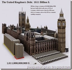 Bagaimana dengan Inggris? Negara maju ini pun memiliki total hutang sebesar 1.611 Milyar US dollar yang hampir setinggi sisi kanan tembok gedung parlemen dan deretan truk- truk pengangkut uang memenuhi parkiran. Jumlah ini sekitar 70% dari total kekayaan negara tersebut. Melampaui standar stabilitas ekonomi Uni Eropa yang ditetapkan maksimal hutang sebesar 60% dari kekayaan total negara.