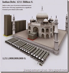 Total hutang India adalah 1.211 Milyar US dollar itu yang berarti apabila ditumpuk akan hampir setinggi kubah Taj Mahal dan tentu saja masih menyisakan 20 truk pengangkut uang terparkir di pelatarannya.